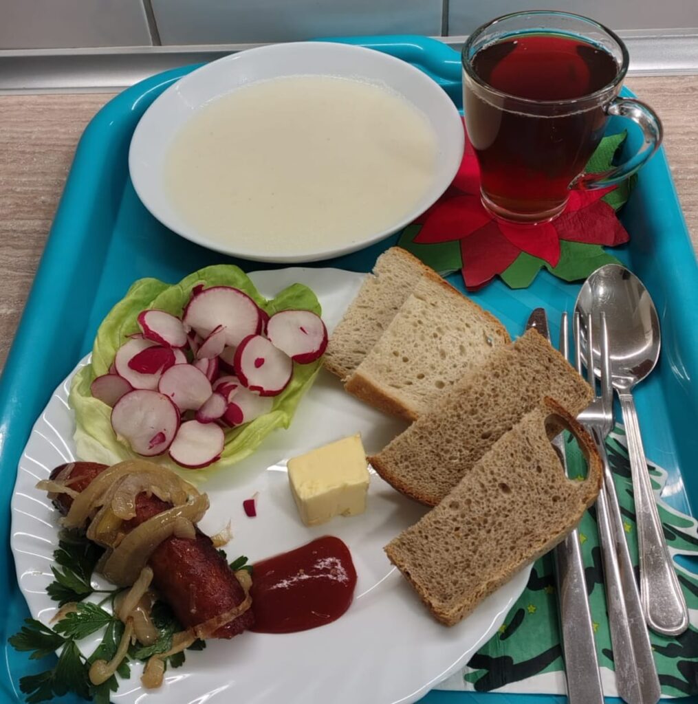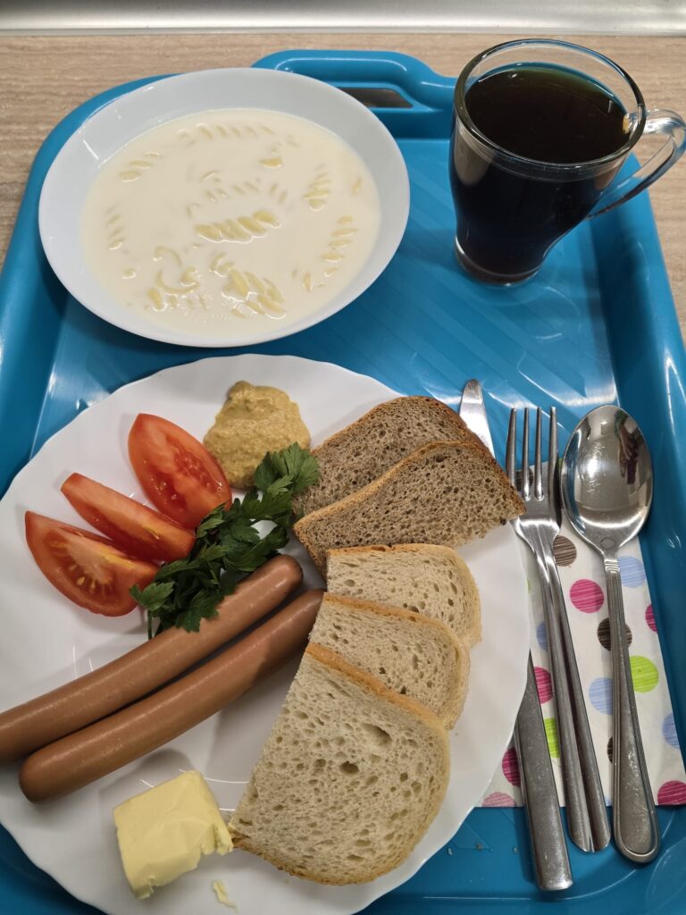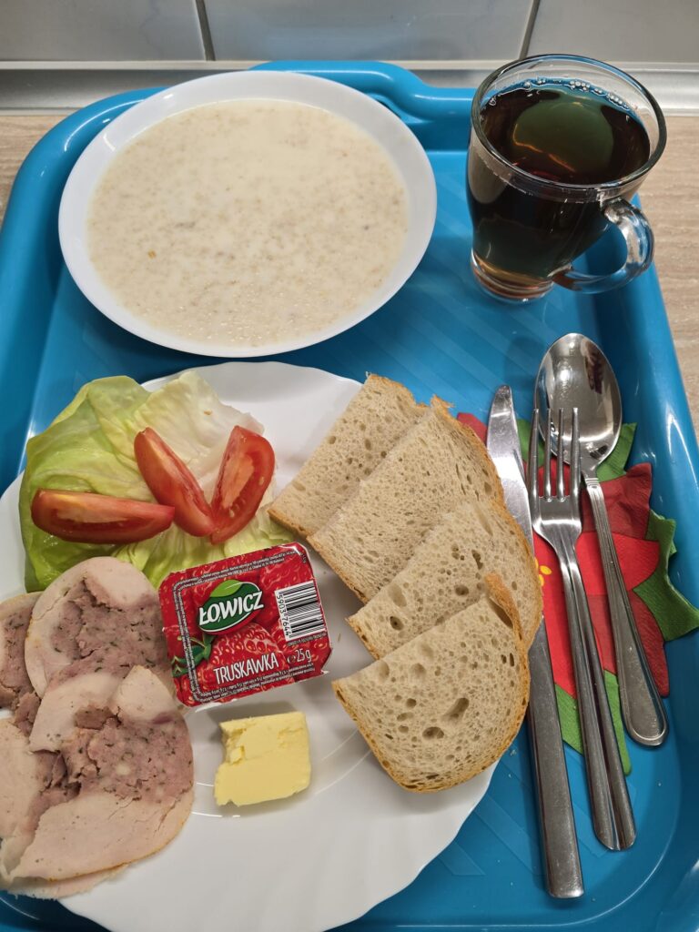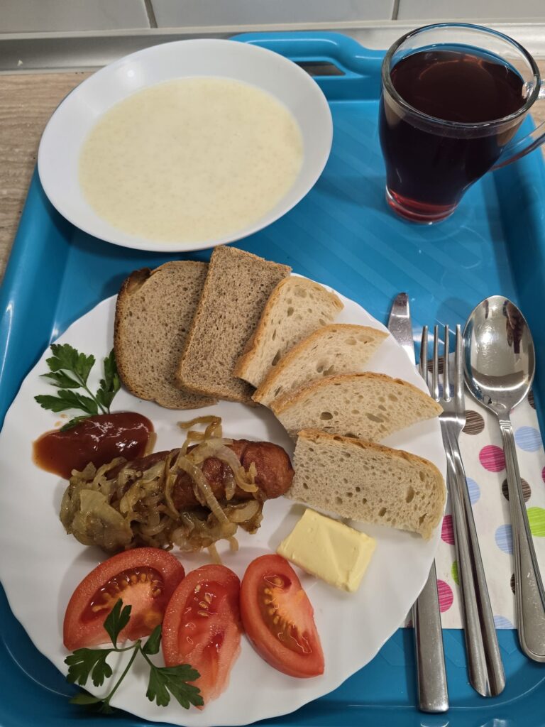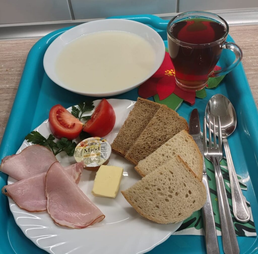 -Zupa mleczna z płatkami owsianymi -Kiełbasa śląska z rusztu z ketchupem – Ogórek świeży -Masło – Pieczywo mieszane -Kawa zbożowa Alergeny: 1,7
