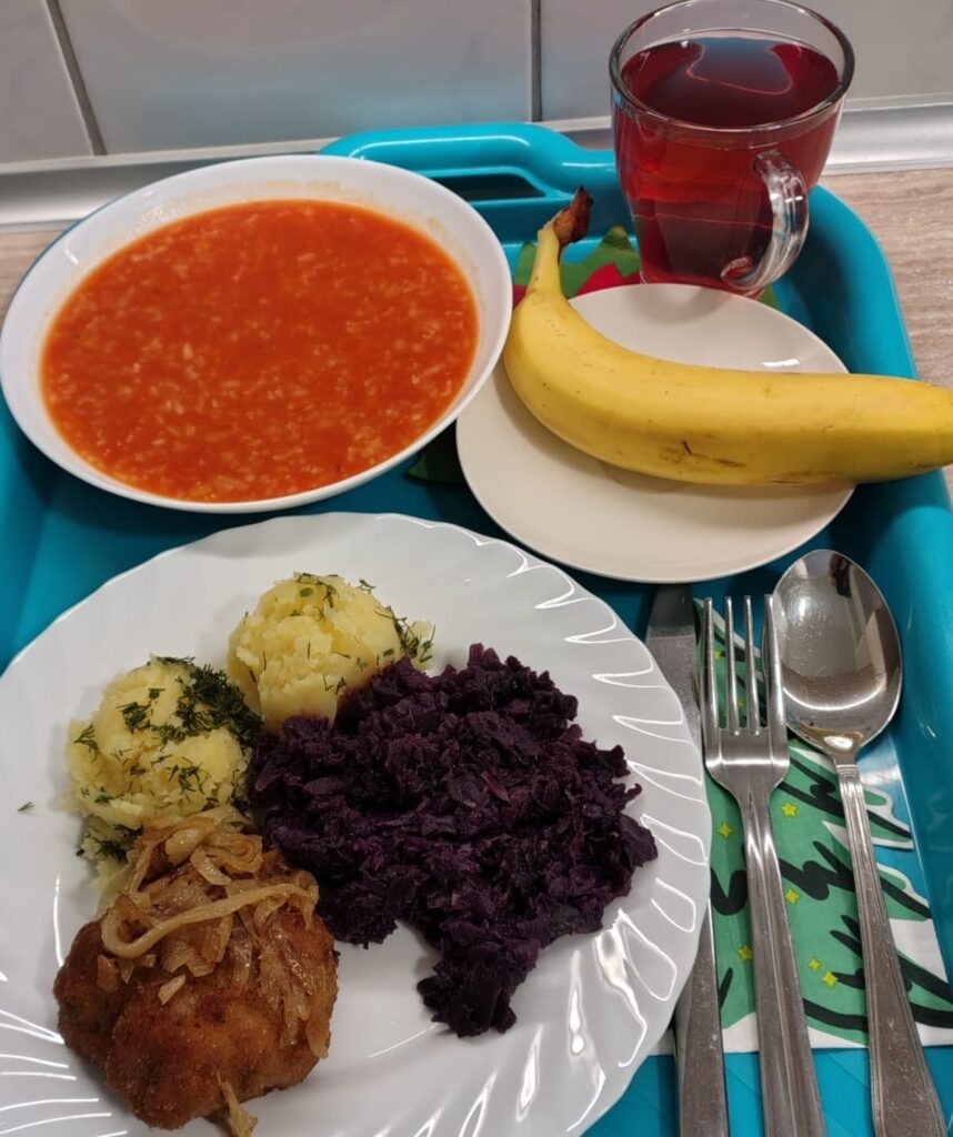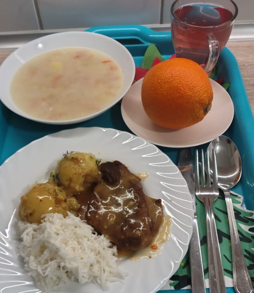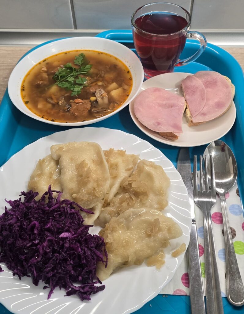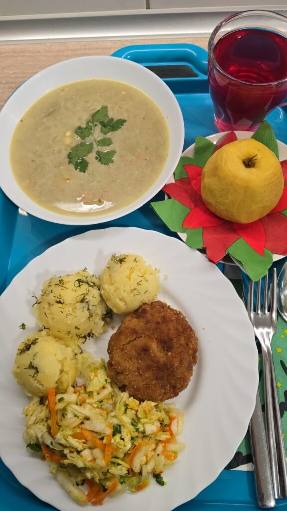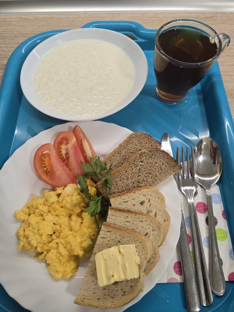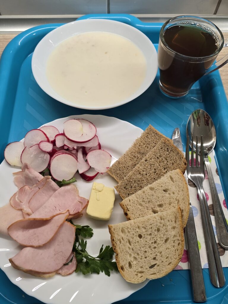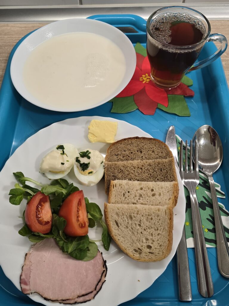 -Zupa mleczna z płatkami owsianymi -Kiełbasa śląska z rusztu z ketchupem – Ogórek świeży -Masło – Pieczywo mieszane -Kawa zbożowa Alergeny: 1,7