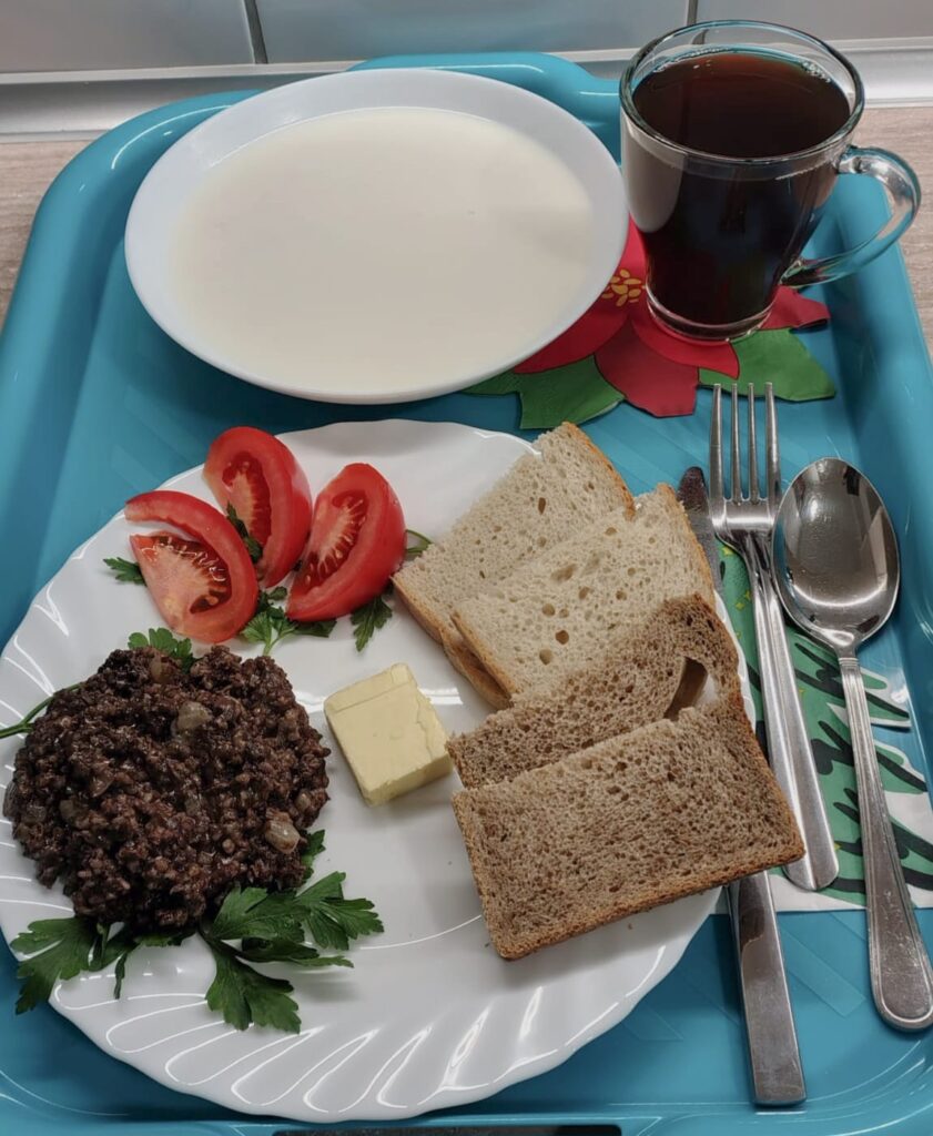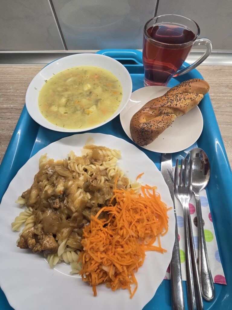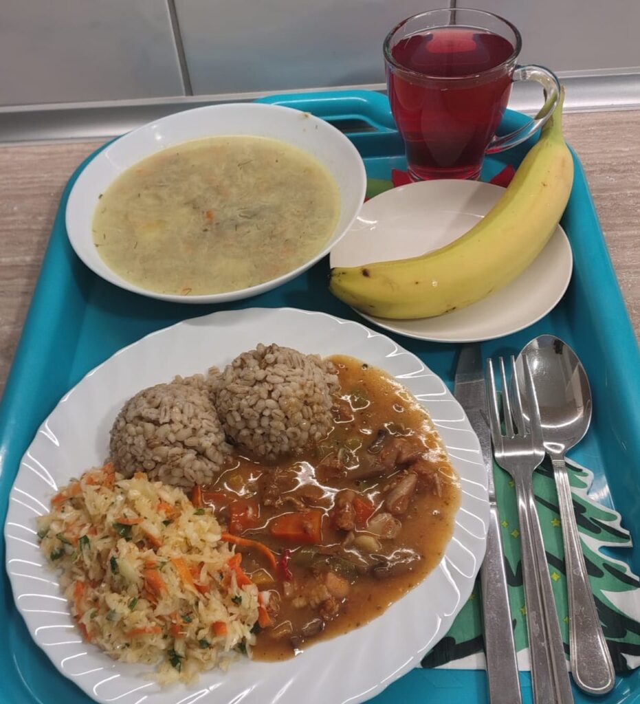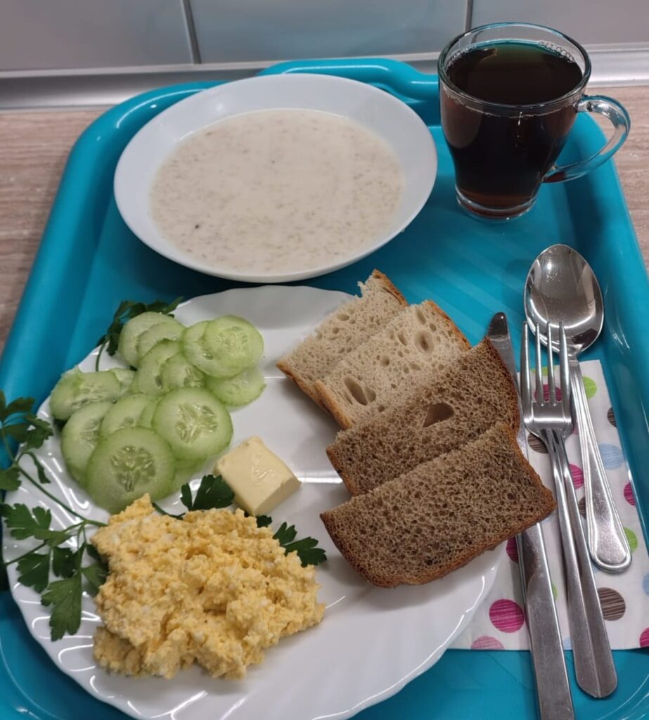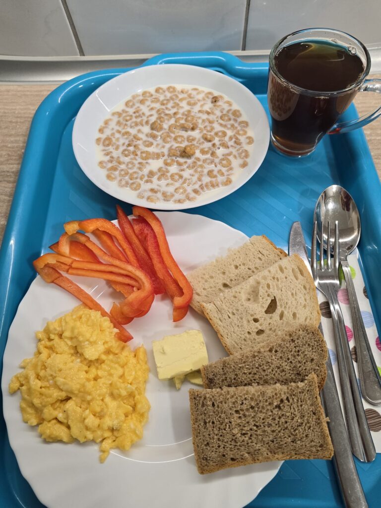 -Zupa mleczna z płatkami owsianymi -Kiełbasa śląska z rusztu z ketchupem – Ogórek świeży -Masło – Pieczywo mieszane -Kawa zbożowa Alergeny: 1,7