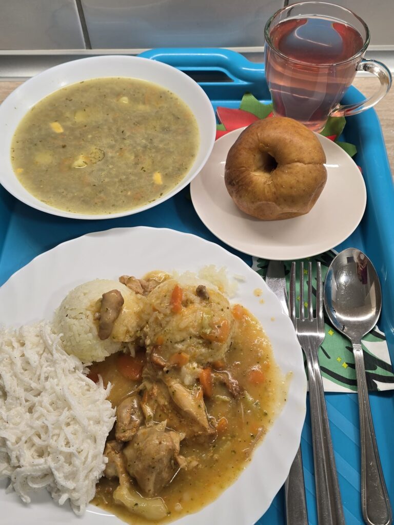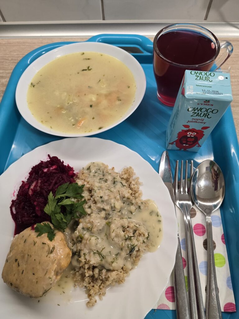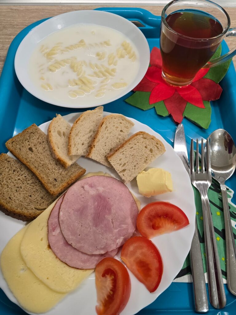 -Zupa mleczna z płatkami kukurydzianymi -Parówka drobiowa z ketchupem -Ogórek świeży -Masło -Pieczywo mieszane -Herbata owocowa bez cukru Alergeny: 1,6,7