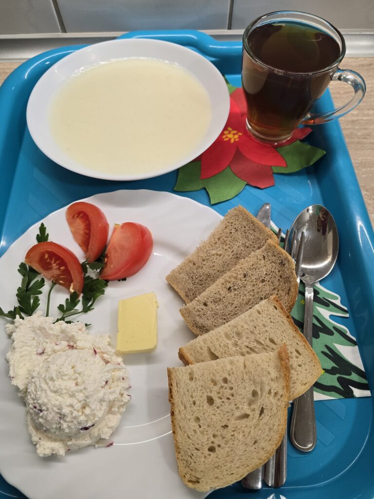 -Zupa mleczna z kaszą manną -Twaróg ze śmietaną i rzodkiewką -Pomidor -Masło – Pieczywo mieszane -Herbata Alergeny: 1,7