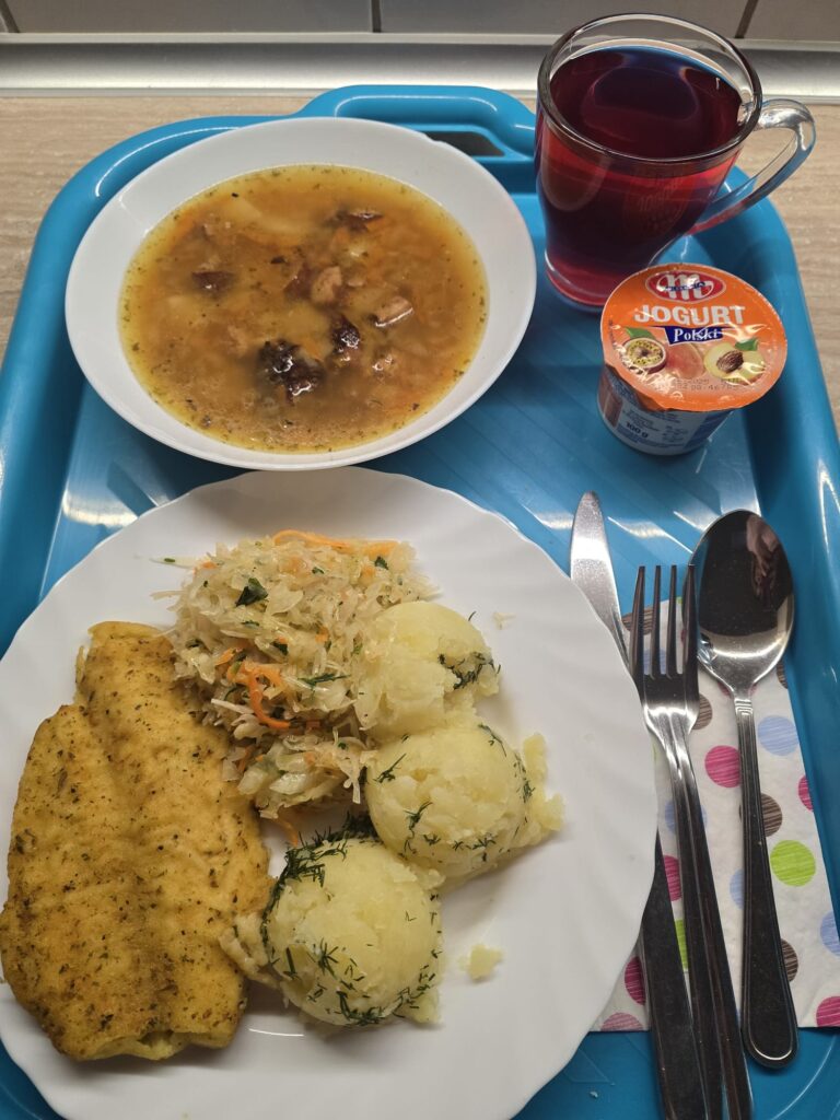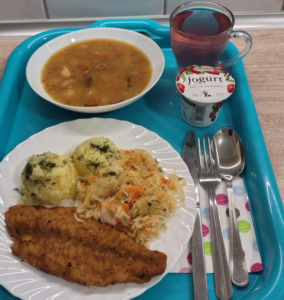 -Zupa fasolowa -Ryba panierowana -Ziemniaki z koperkiem -Surówka z kiszonej kapusty -Kompot bez cukru Alergeny: 1,3,4,9 PODWIECZOREK Jogurt owocowy 1szt. – 90kcal Alergeny: 7