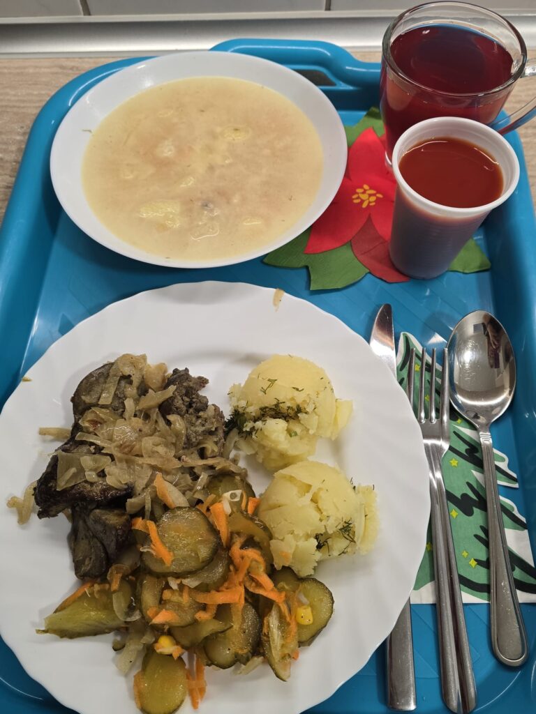 – Zupa kalafiorowa – Wątróbka z cebulą – Ziemniaki gotowane – Sałatka szwedzka – Kompot bez cukru Alergeny: 1,7,9 PODWIECZOREK Sok pomidorowy 200ml – 32kcal Alergeny: 1,3,7