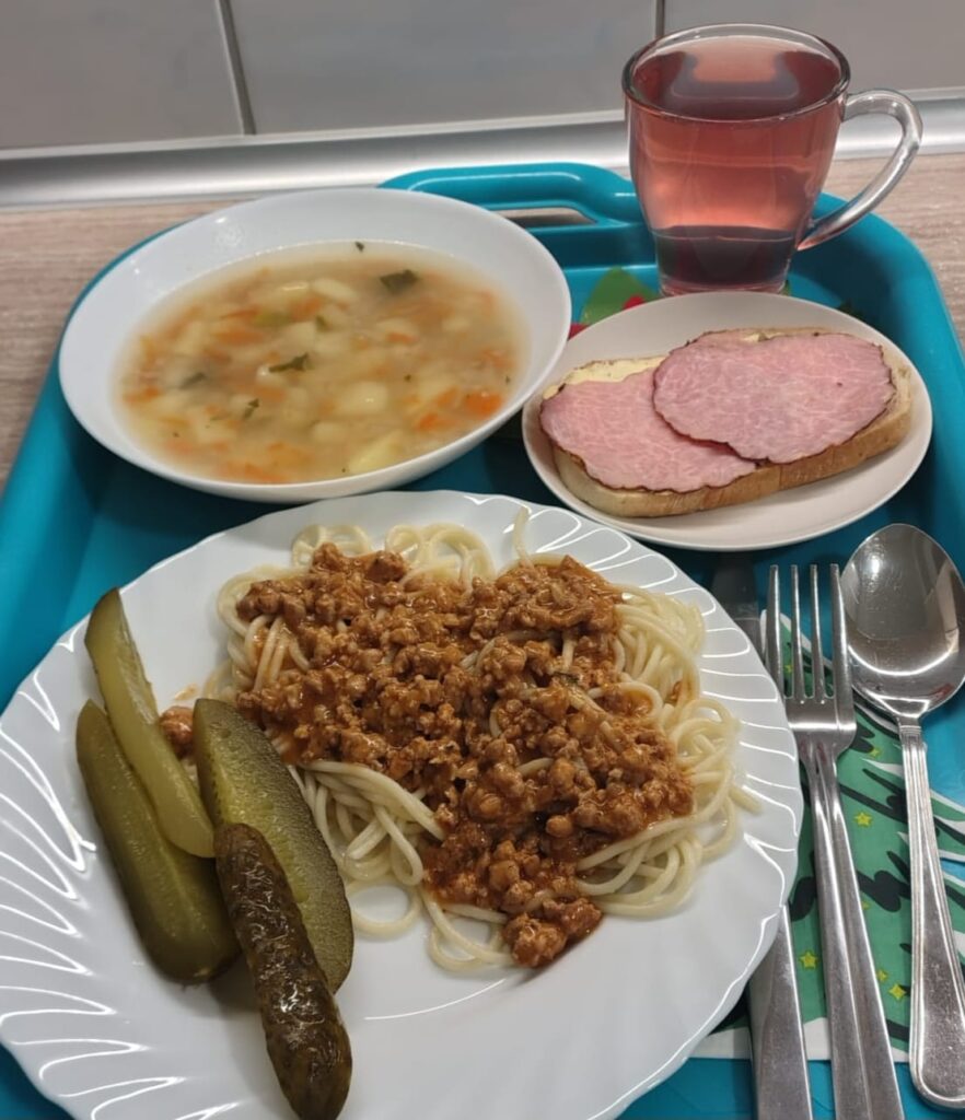 – Krupnik jęczmienny z ziemniakami -Makaron spaghetti z sosem bolońskim -Ogórek kiszony -Kompot bez cukru Alergeny: 1,9 PODWIECZOREK Kanapka z masłem i wędliną wieprzową 1szt. – 141kcal Alergeny: 1,6,7