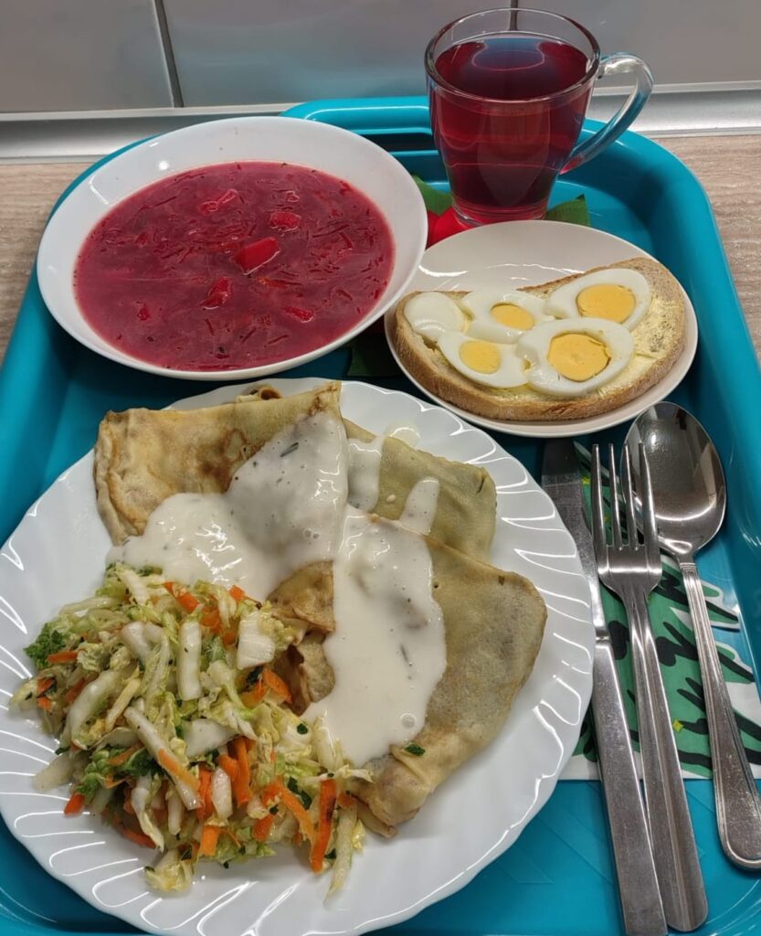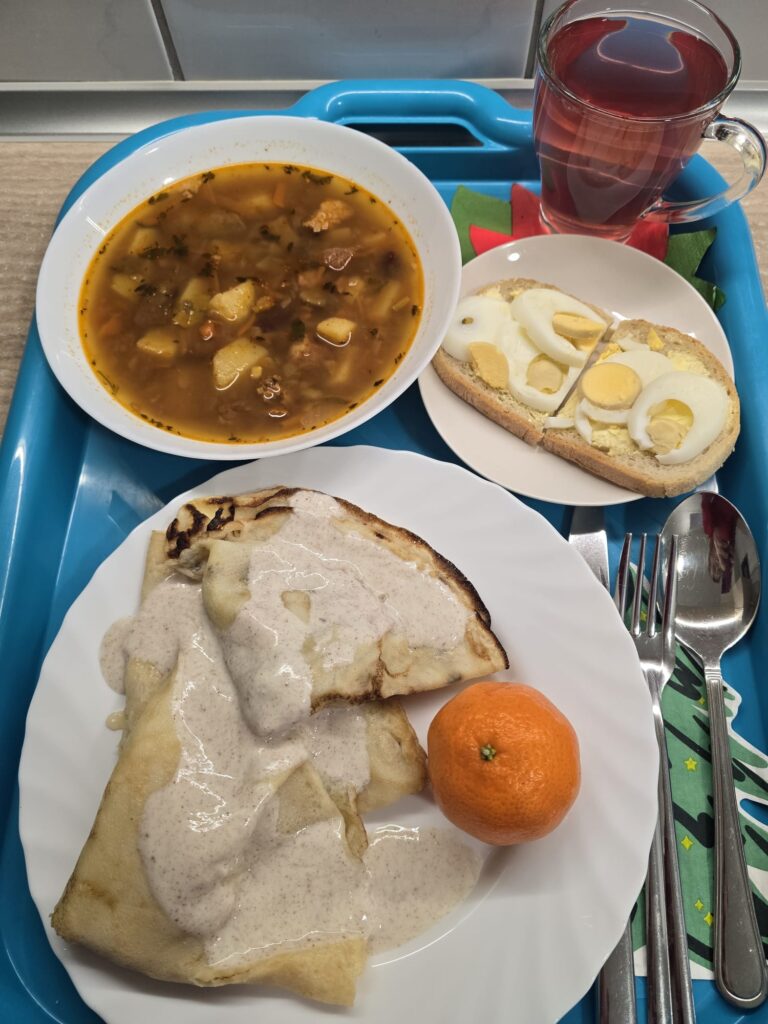 -Barszcz czerwony z ziemniakami – Naleśniki z twarogiem i szpinakiem – Surówka z kapusty pekińskiej -Kompot bez cukru Alergeny: 1,3,7,9 PODWIECZOREK Kanapka z masłem i jajkiem 1szt. – 141kcal Alergeny: 1,3,7