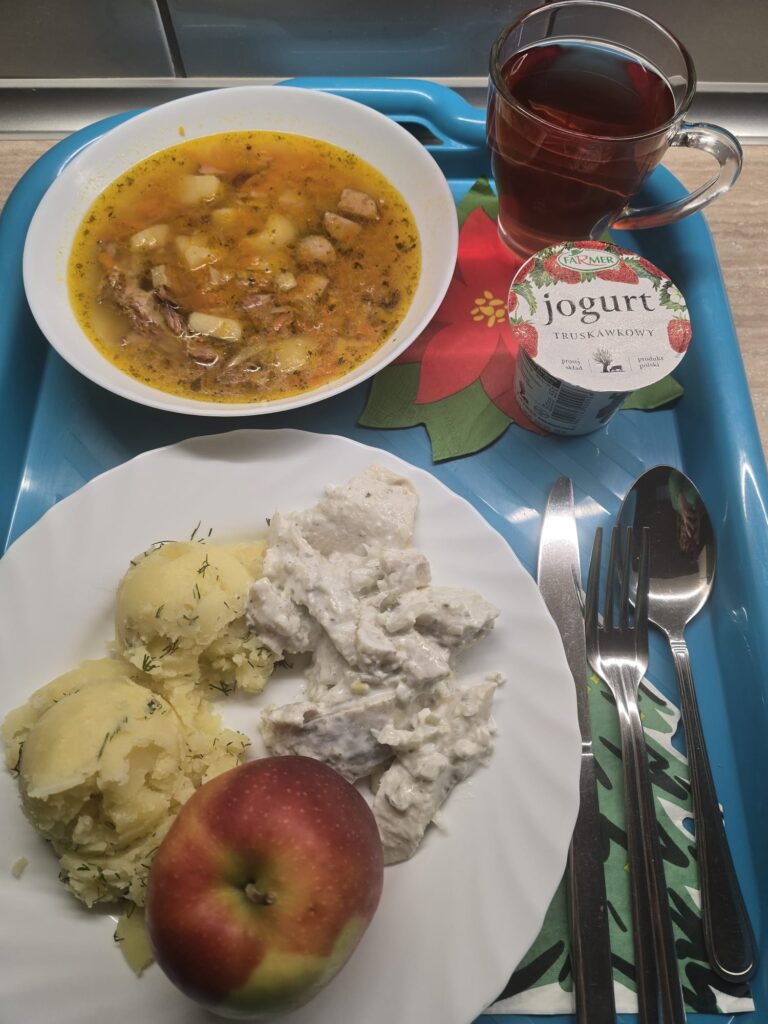 -Zupa grochowa -Śledź w śmietanie z cebulką i groszkiem -Ziemniaki z koperkiem -Jabłko -Kompot bez cukru Alergeny: 1,4,7,9 PODWIECZOREK Jogurt owocowy 1szt. – 90kcal Alergeny: 7