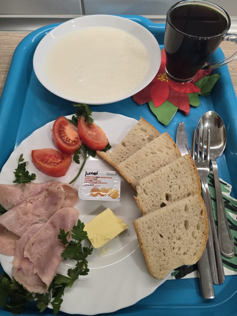 -Zupa mleczna z ryżem -Jajko z majonezem -Wędlina wieprzowa -Sałatka z pomidora i roszponki-Masło – Pieczywo mieszane -Herbata Alergeny: 1,3,6,7,10